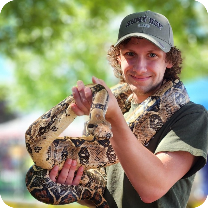 Billy has been with G&G Animals since 2022. He obtained his Bachelors Degree in Wildlife Science from SUNY ESF in 2021. He currently works with NYS Parks and helped us to partner with NYS Parks for educational wildlife presentations within State Parks. He previously gained 2 years of experience as a Zookeeper, working at a Private Zoo. Billy’s favorite work tasks include educating the public about Chameleons, socializing with the animals, and creating enrichment.
